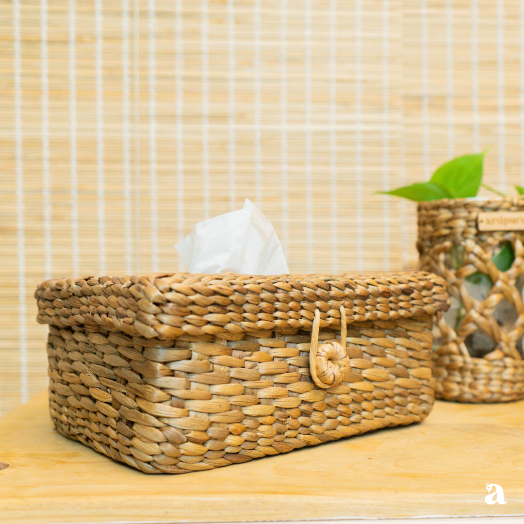 - Each tissue box holder is meticulously woven using locally sourced water hyacinth, a sustainable and eco-friendly material. The natural fibers of the water hyacinth create a sturdy and durable construction, ensuring that your tissue box is securely held while adding a touch of natural beauty to your space.
