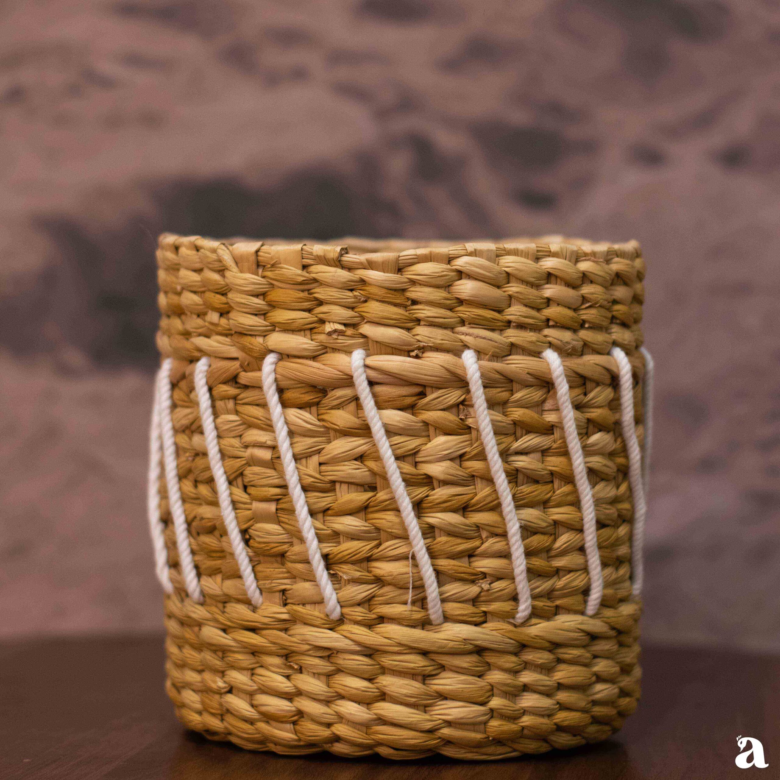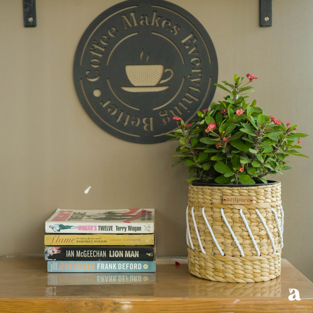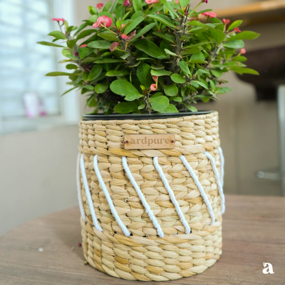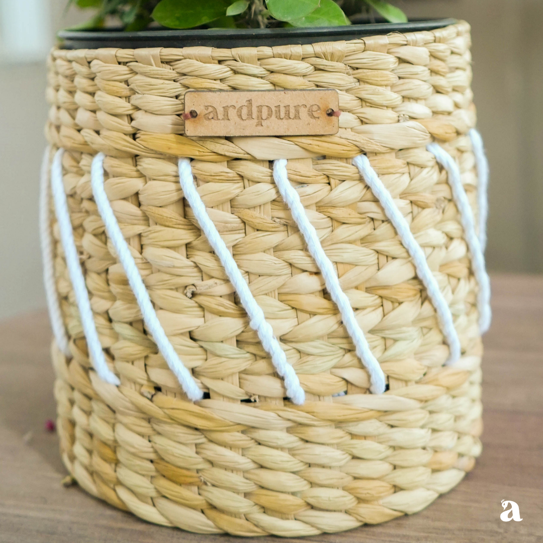Crafted from durable Kauna grass (water reed native to the state of Manipur) combined with pleasant white cord for added flair, it provides a sturdy foundation for your favorite plants, transforming any spot into a green oasis.